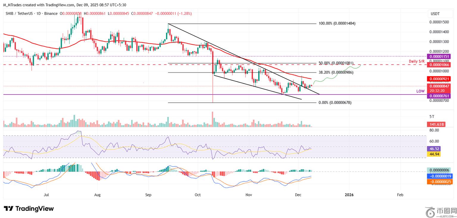 12月3日,柴犬(Shiba Inu)股价突破了下降楔形形态(由两条趋势线连接多个高点和低点构成)。然而,其上涨势头未能持续,在0.0000092美元附近的50日指数移动平均线(EMA)处受阻。不过,柴犬(SHIB)在上方趋势线附近获得支撑,周一上涨近3%。截至周二发稿时,柴犬(SHIB)股价在0.0000092美元附近徘徊。