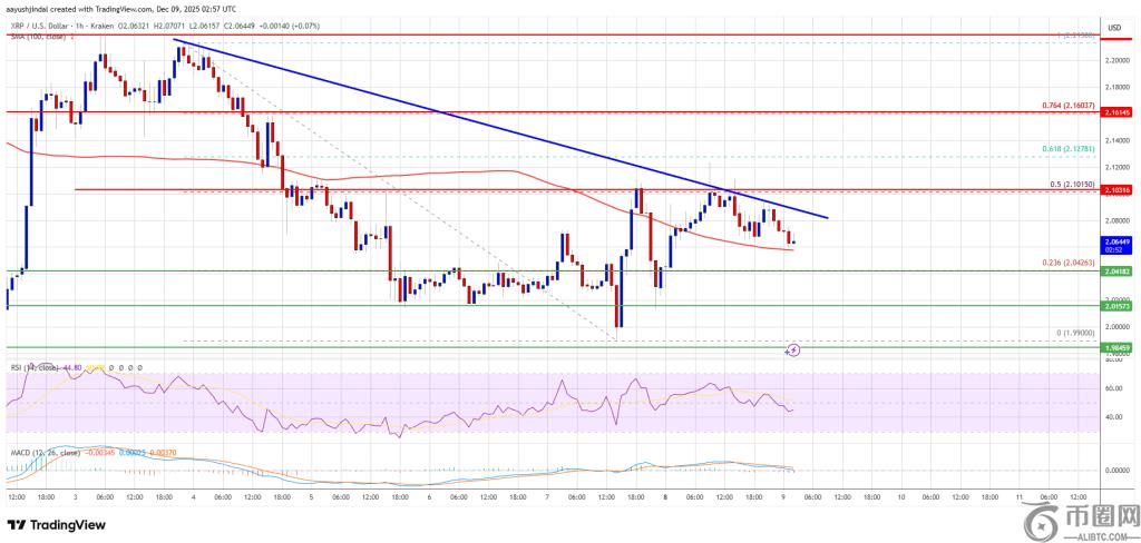 XRP价格在2.080美元上方开始反弹。目前价格正在盘整,可能难以突破2.10美元的阻力位。