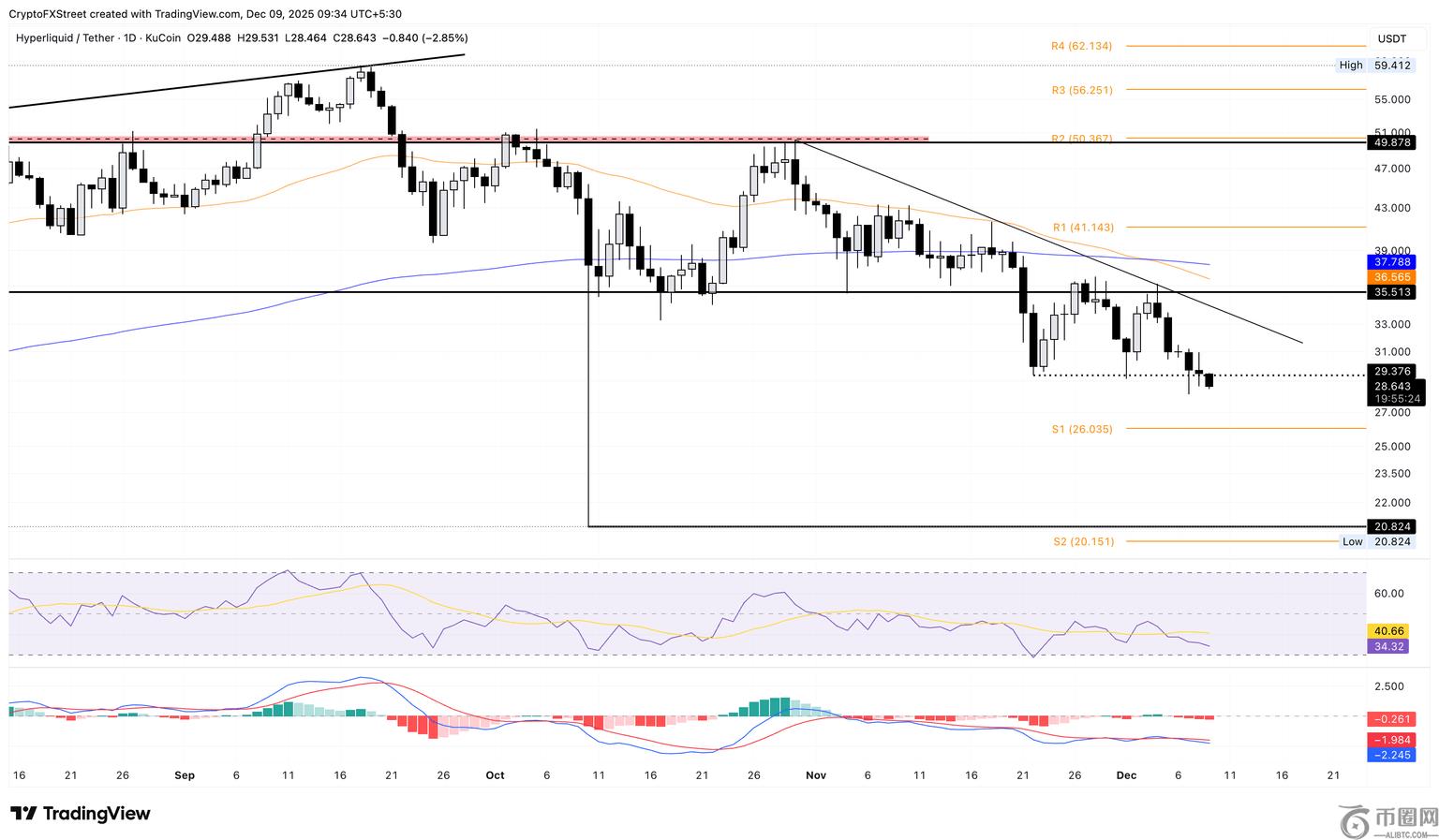 随着抛售压力增大,Hyperliquid 可能将目标价位设在 20 美元。
