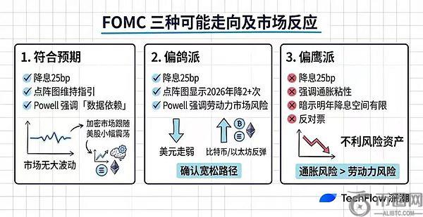 概率较低但不能排除的是「偏鹰派」:虽然降息 25bp,但 Powell 强调通胀粘性,暗示明年降息空间有限;或者出现多张反对票,显示内部对继续宽松存在阻力。