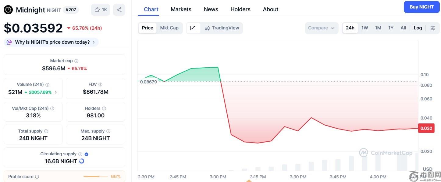 惨淡开局:$NIGHT 多交易所上线后价格暴跌 65%