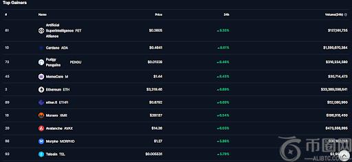 今日加密货币涨幅榜:FET联盟领涨,涨幅达9.35%