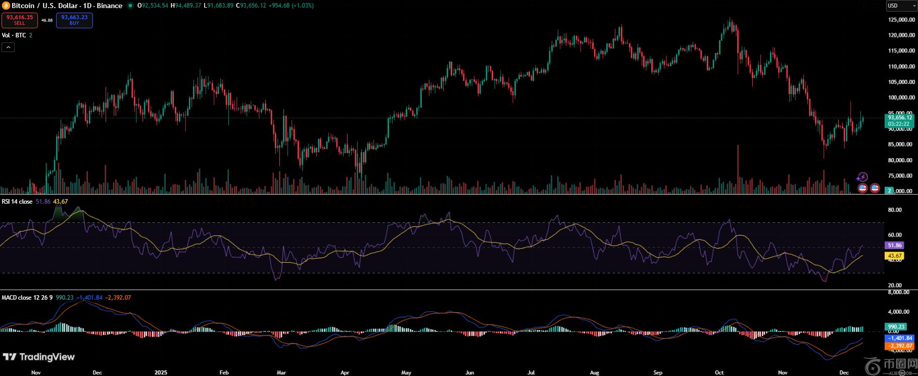 比特币日线图显示,在11月价格急跌至90,000美元下方后正逐步企稳。近期反弹至93,600美元表明买盘正在捍卫更高的低点——这种结构暗示下行压力正在减弱。