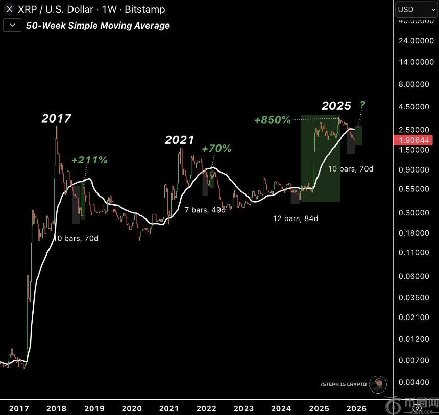 根据Steph的分析,XRP自本轮下跌开始以来,一直低于50周SMA。虽然这表明市场承受着巨大的空头压力,但历史数据显示,当XRP在50至84天内持续低于该均线后,往往会迎来爆发式反弹。