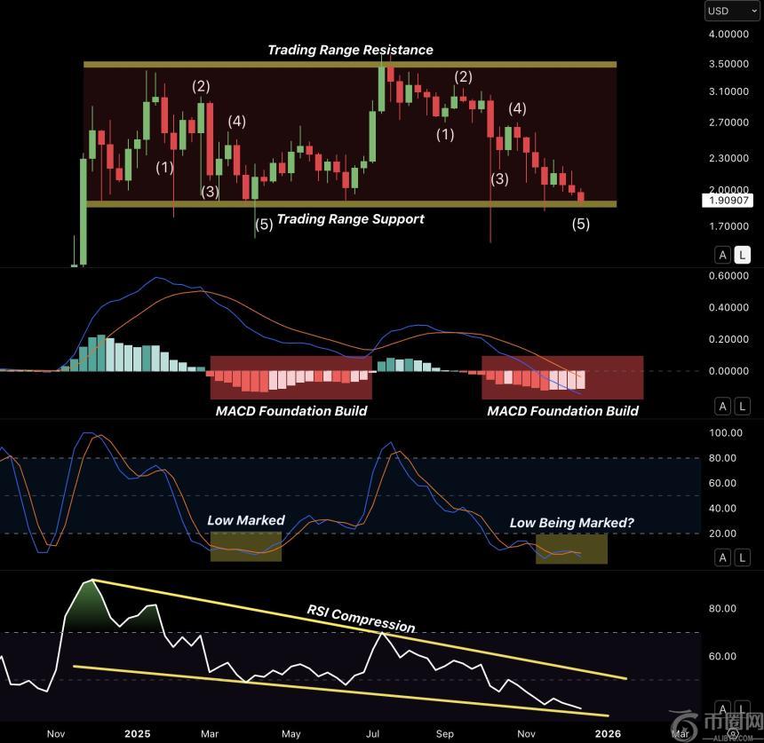 与此同时,分析师Chart Nerd指出,目前大多数XRP指标已显示可能触底的信号,暗示复苏可能即将到来。具体而言,RSI指标已进入超卖状态,MACD指标也显示出稳固的基础。此外,RSI指标呈压缩态势,呈现五浪结构,进一步支持了这一观点。