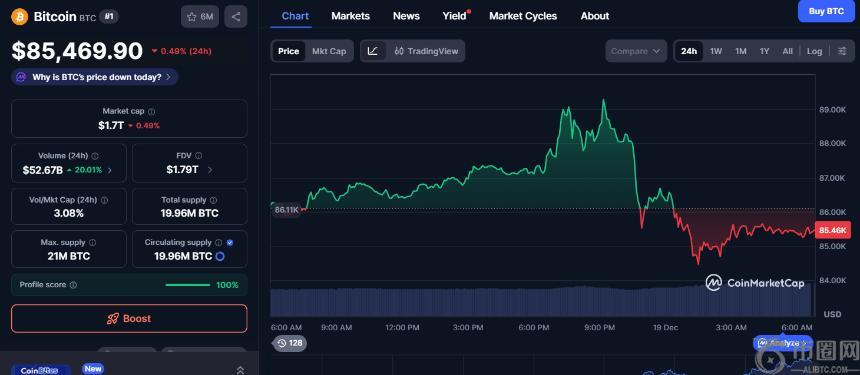 比特币 (BTC) 今日交易价格为 85,469.9 美元,在过去 24 小时内下跌 0.49%,交易量为 526.7 亿美元,市值为 1.7 万亿美元。