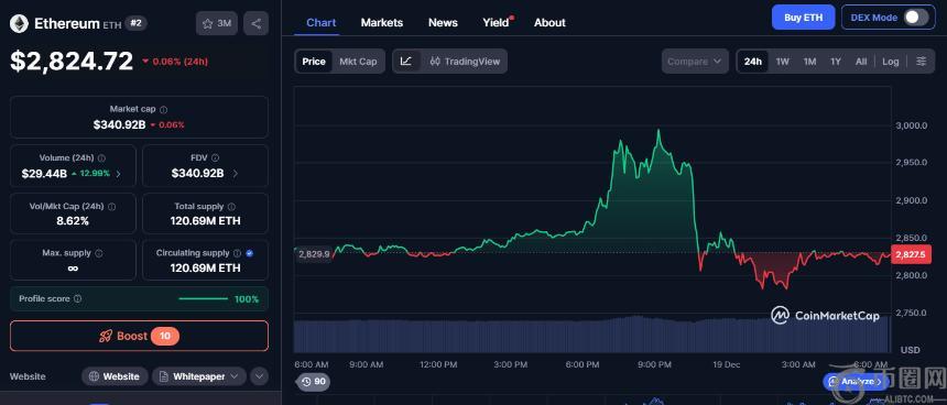 以太坊 (ETH) 价格今天股价为 2824.72 美元,24 小时内上涨 0.06%,交易量为 294 亿美元,市值为 3409 亿美元。