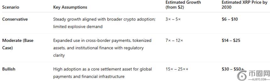 在保守估计下,ChatGPT预测,如果XRP**与整体市场同步稳步增长,到2030年其价格可能在6美元至10美元之间。这将意味着较其目前接近1.80美元的价格上涨约200%至400%。