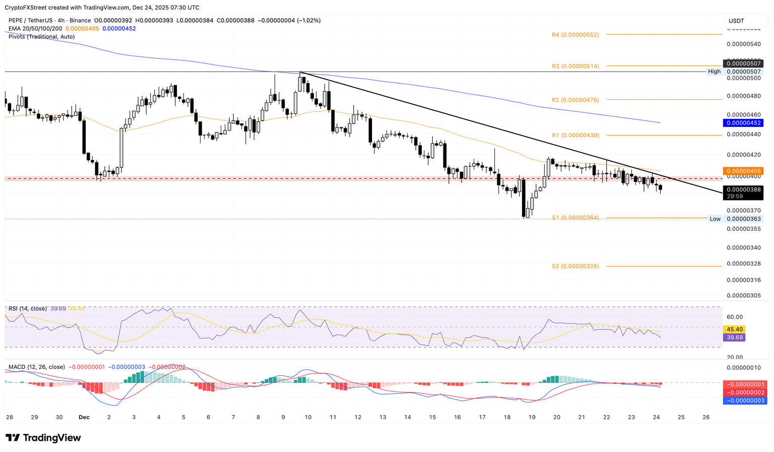 在4小时对数图上,PEPE价格从连接12月9日和22日高点的局部阻力趋势线附近(接近0.00000400美元)延续了下跌反转趋势。截至发稿时,PEPE周三下跌2%,目标指向12月18日的低点0.00000363美元,接近S1枢轴点0.00000364美元。