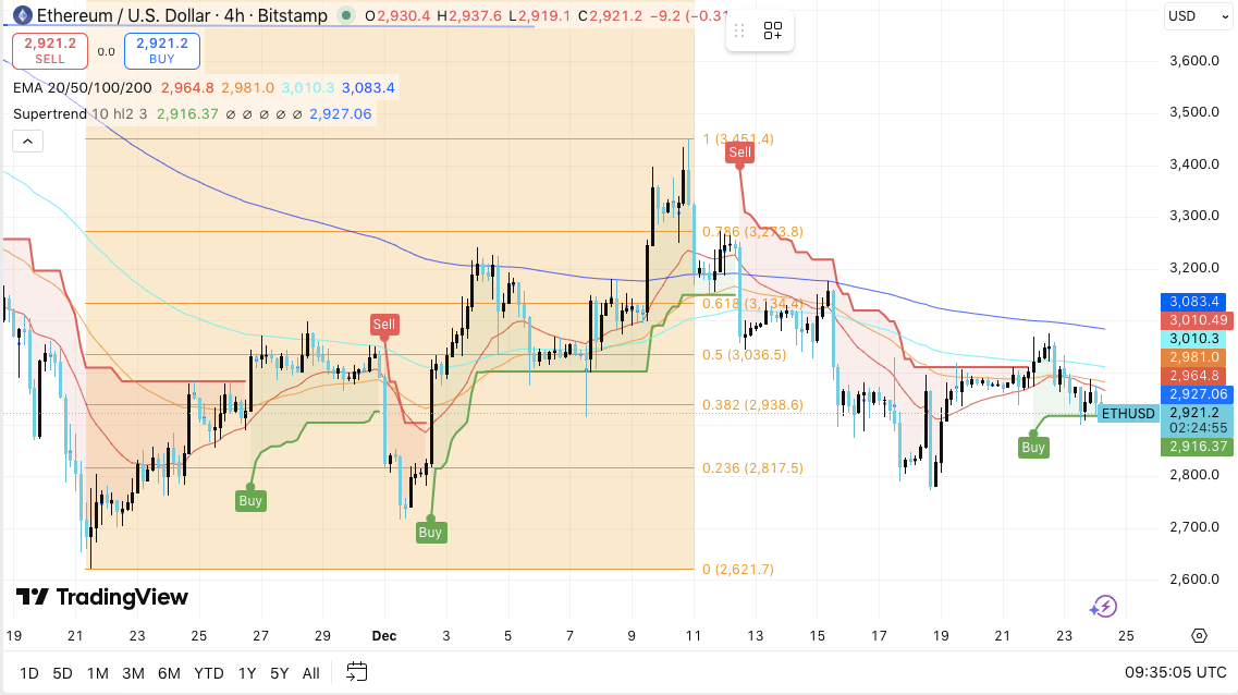 以太坊持续低于关键移动平均线,这些平均线目前决定着其短期走势。50周期均线(EMA)在2965美元附近构成直接阻力,而100周期均线在2980美元附近则加剧了抛售压力。此外,3083美元附近的200日均线是主要的转折点。只要以太坊价格保持在该区域下方,上涨尝试就会不断遭遇阻力。