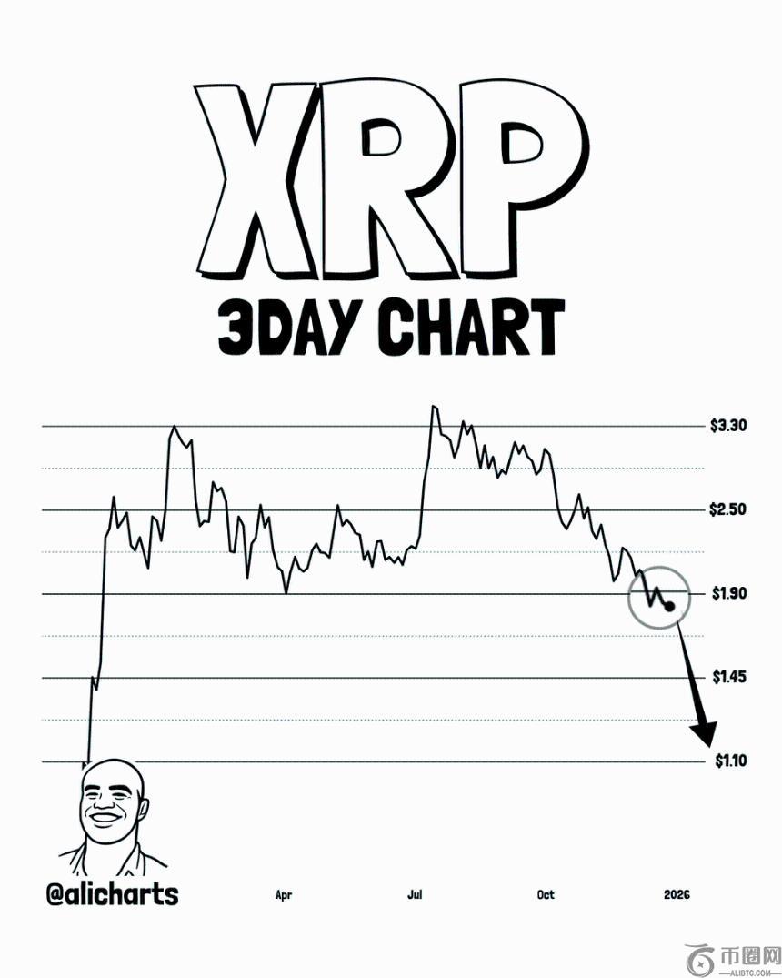 市场资深人士阿里·马丁内斯近日确认,XRP已跌破关键支撑位1.9美元,进一步明确了后续价格走向。自10月以来,XRP价格持续承压,尽管曾短暂冲高至3.1美元,但受比特币(BTC)跌破10万美元心理关口影响,整体市场悲观情绪蔓延,导致XRP快速回落。 当前价格约为1.86美元,本季度累计跌幅达34%,12月单月下跌12.97%,可能成为自2022年第四季度以来**连续三个月下跌。马丁内斯指出,下一重要支撑位位于1.1美元,若触及该水平,意味着从现价下跌近41%。值得注意的是,过去一年中XRP未曾触及此价位。