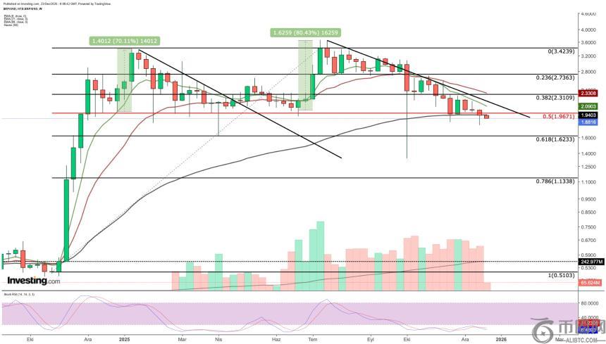 根据马丁内斯的分析,1.9美元曾在11月下旬为市场提供重要防线,但12月中旬再度失守。目前价格在1.86美元附近波动,空头力量增强。他强调,1.1美元是接下来必须密切关注的关键区域。 此外,区块链分析显示,过去一周活跃地址数量从46,000个下降至38,500个,反映出用户参与度下滑,释放看跌信号。
