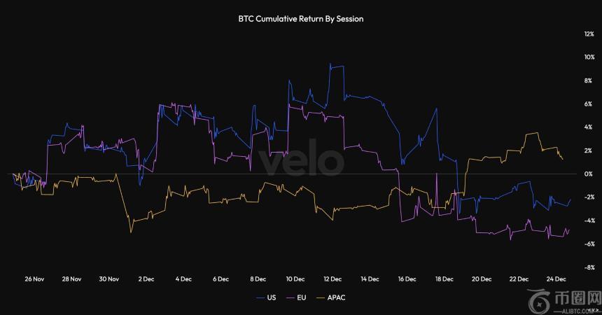 按交易时段追踪比特币累计收益的数据显示,亚太地区的交易时段虽然出现了小幅但持续的上涨,而同期美国和欧洲的交易时段则呈下跌趋势。