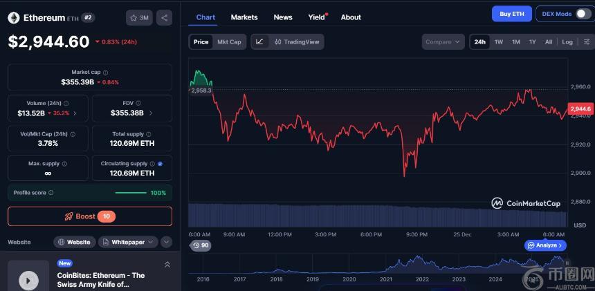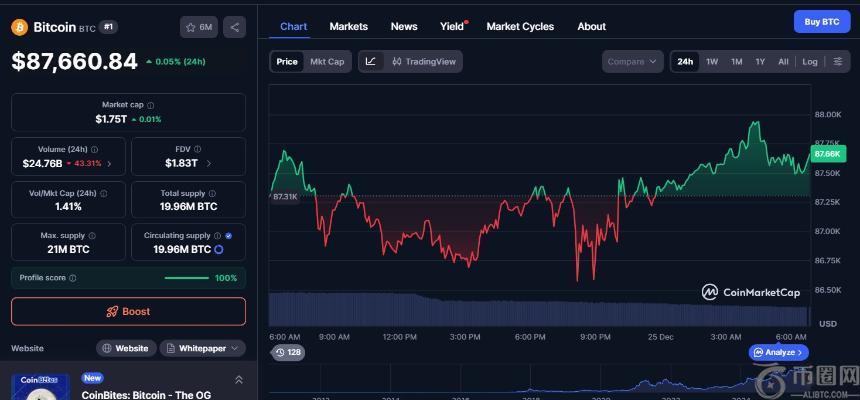 比特币价格报87660.84美元,24小时涨幅0.5%,交易量达245.7亿美元,市值为1.75万亿美元。以太坊价格为2944.60美元,小幅下跌0.83%,交易量135.3亿美元,市值3553.2亿美元。
