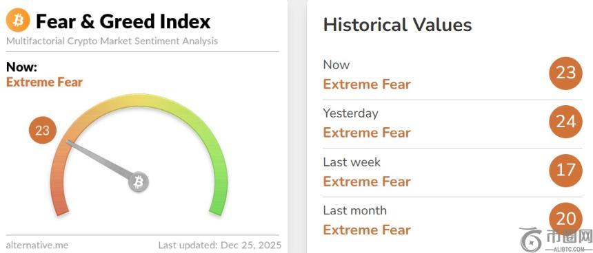 今日指数为23,略低于昨日的24,但高于上周的17和上月的20。尽管恐慌程度略有缓解,但宏观经济压力、监管不确定性以及持续抛售行为仍压制市场信心。