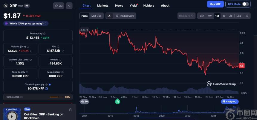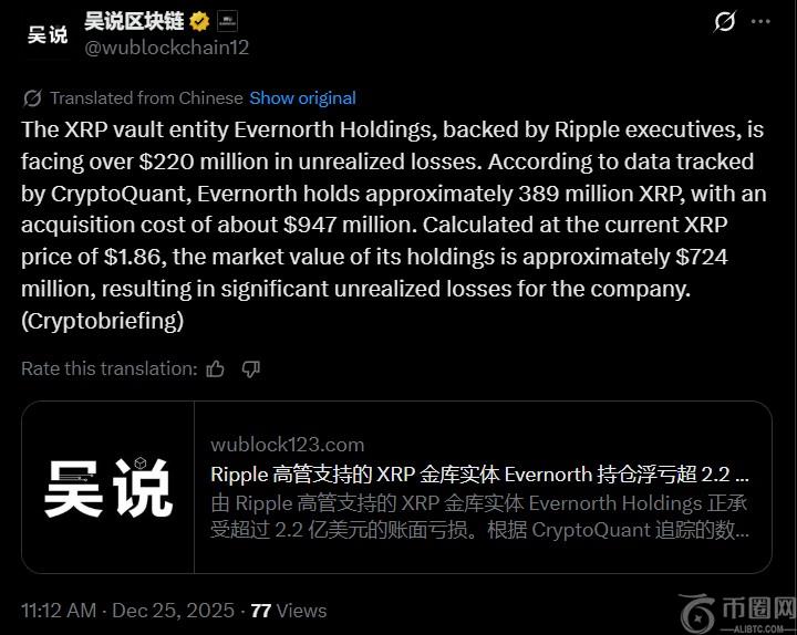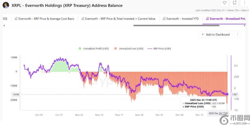 Evernorth Holdings持有的3.89亿枚XRP**,购入均价较高,受近期市场调整影响,当前价格约为1.86美元,总价值下降至7.24亿美元,形成显著未实现亏损。