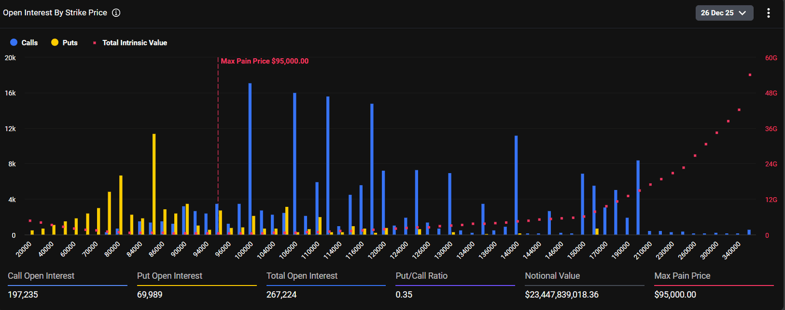 Derbit数据显示,周五将有总价值234.7亿美元的比特币期权合约到期。市场整体偏向看涨,看涨期权未平仓合约量显著高于看跌,看涨/看跌比率仅为0.35。**行权价设定在95,000美元,意味着若价格触及该水平,多数合约将作废,期权卖方获利**。