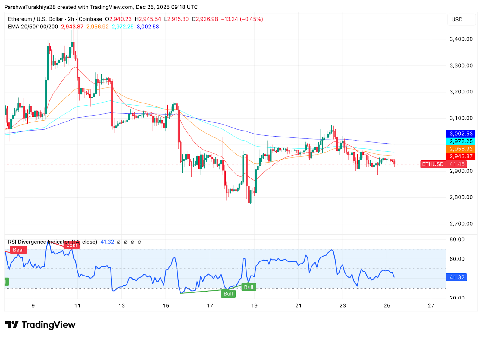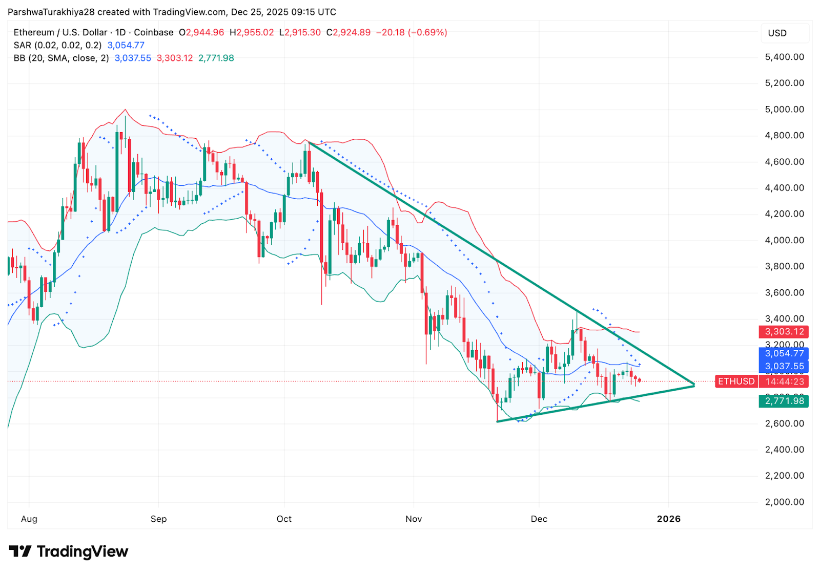 以太坊价格今日在2925美元附近波动,此前尝试突破短期阻力未果。市场仍处于自11月中旬形成的对称三角形结构中,买家守住上升支撑位,而卖家则沿10月高点以来的下降趋势线施压。随着12月26日临近,这一形态可能酝酿关键突破。