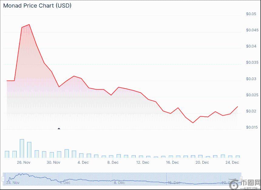 今年以来,Monad价格下跌26.9%,但近期出现显著反弹,单日涨幅达12%,报收于0.02192美元。这一波动反映出市场对项目基本面的重新评估,而非单纯情绪驱动。