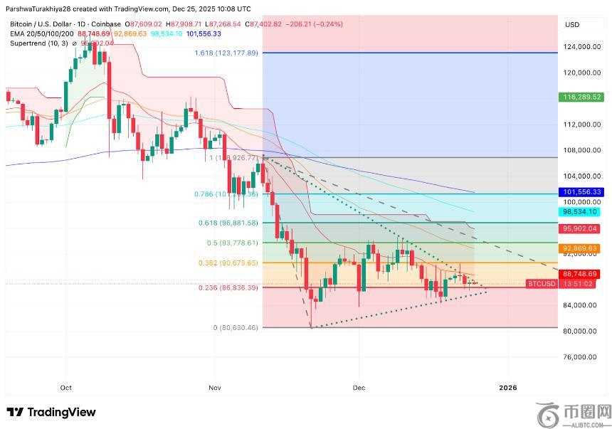 比特币价格今日在87,400美元附近交易,此前它再次尝试突破短期阻力位但未能成功。价格仍然被压制在下降趋势线和关键斐波那契回撤位下方,随着12月26日的临近,卖方继续占据主导地位。距离主要期权到期日还有几个小时,市场呈现收紧状态,而非突破。