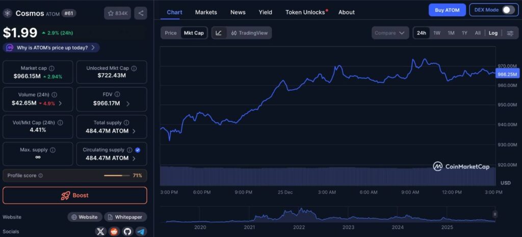 宇宙**(ATOM)市值现接近9.66亿美元,24小时涨幅超3%,表现优于大盘。虽过去30天仍下跌近19%,但近期发展揭示中长期基本面正在修复。