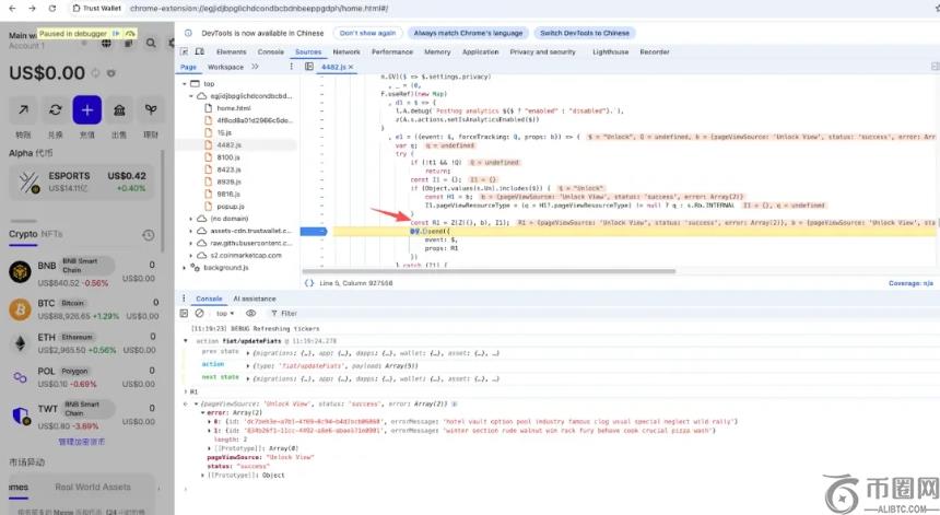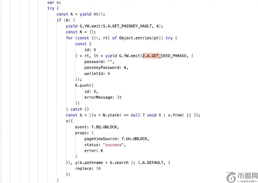 该恶意代码会遍历用户所有钱包,并在解锁过程中发起“获取助记词”的请求。攻击者利用用户输入的密码(password 或 passkeyPassword)解密助记词后,将其发送至恶意域名 api.metrics-trustwallet[.]com。