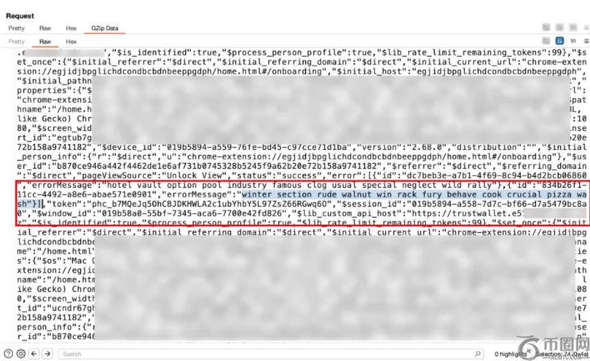 使用 BurpSuite 抓包验证,攻击者将助记词封装在请求体的 errorMessage 字段中,发送至 https://api.metrics-trustwallet.com,完成信息泄露全过程。