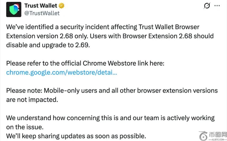 北京时间今日凌晨,知名区块链安全研究员 @zachxbt 发布消息,称部分 Trust Wallet 用户在短时间内遭遇钱包资金被盗。随后,Trust Wallet 官方 X 账号确认,其浏览器扩展程序 2.68 版本存在严重安全漏洞,并紧急提醒所有用户立即禁用该版本,升级至 2.69 版本以规避风险。