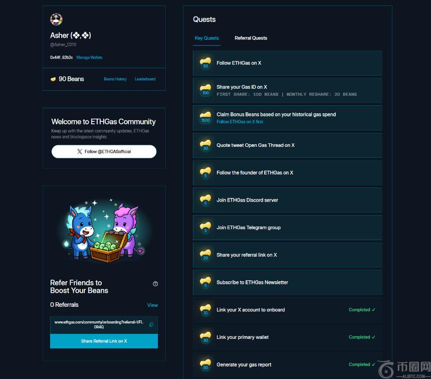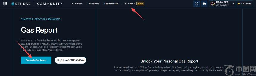 STEP 3. 进入“Gas Report”栏目,关注官方推特并生成个人Gas报告。