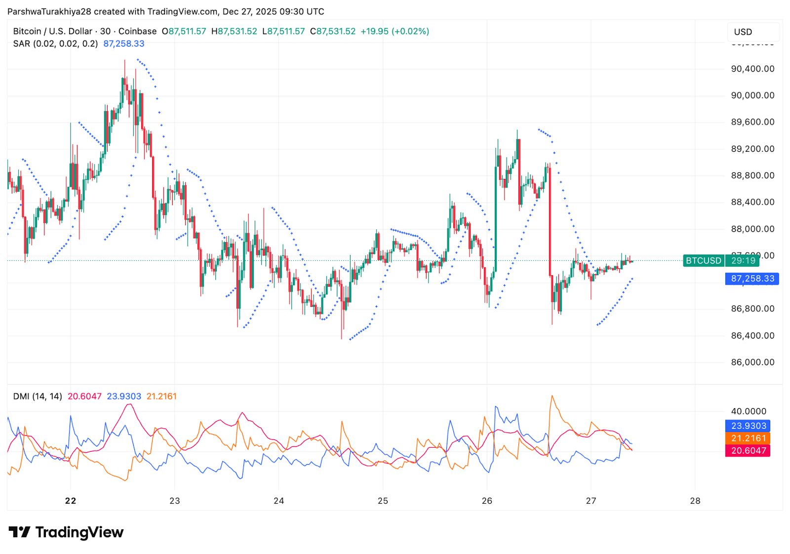 30分钟图表显示,比特币在89,500美元反弹失败后,现于87,000至88,000美元区间震荡。抛物线转向指标(Parabolic SAR)略有转为支撑迹象,但动能仍弱。DMI指标未显示明确趋势方向,表明市场处于横盘整理阶段。