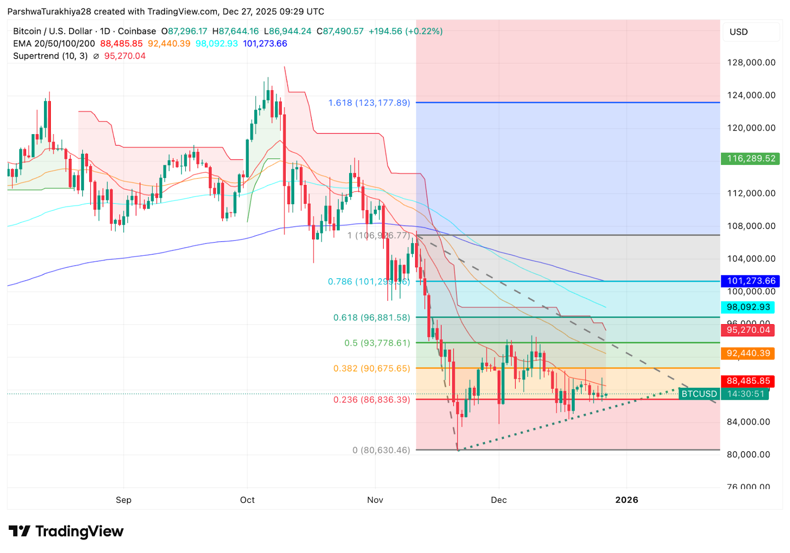 比特币价格今日在87,500美元附近窄幅波动,市场正消化圣诞节期间的剧烈波动。本周经历闪崩恐慌、大量衍生品到期以及关键移动平均线下方的技术压制,价格虽在支撑位获得买盘抵抗,但未能扭转整体下行格局。