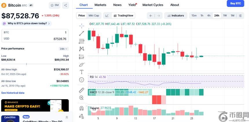 尽管黄金和白银创历史新高,比特币价格却未跟涨,目前徘徊在87,500美元附近,较三个月前高点126,198美元下跌近30%。