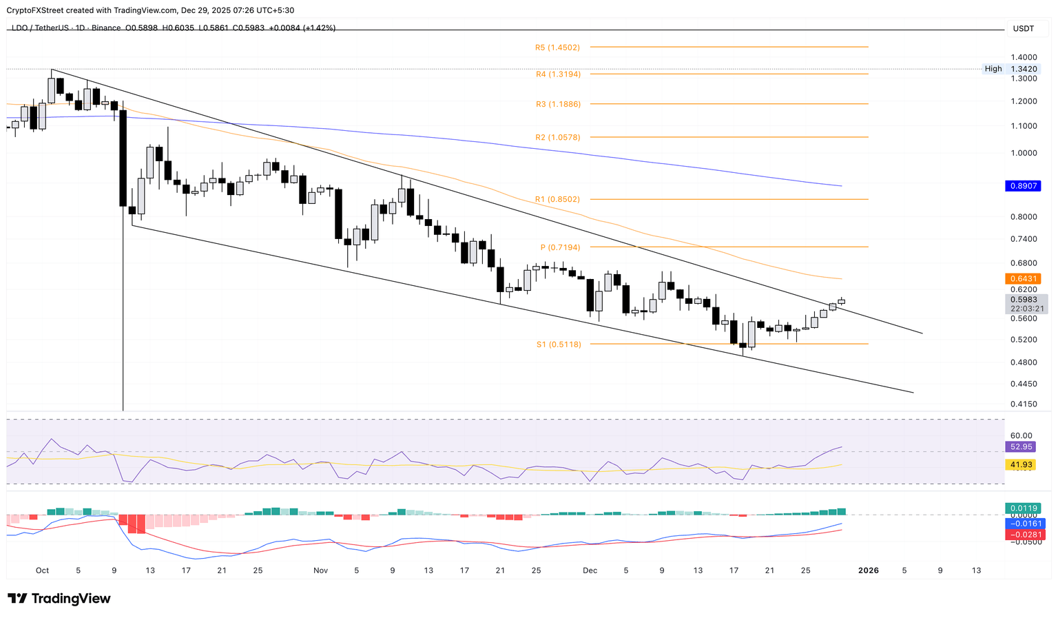 截至周一发稿时,Lido DAO 上涨超过 1%,连续第六个交易日走高。LDO **于周日突破下降楔形形态,目标价位为 0.6431 美元的 50 日均线。