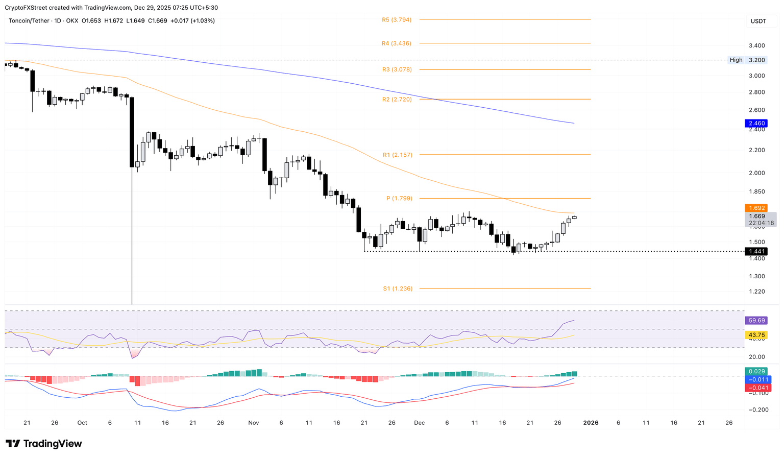 如果 TON 从 1.69 美元反弹,可能会重新测试 1.444 美元的支撑位,该支撑位自 11 月 21 日以来一直保持完好。