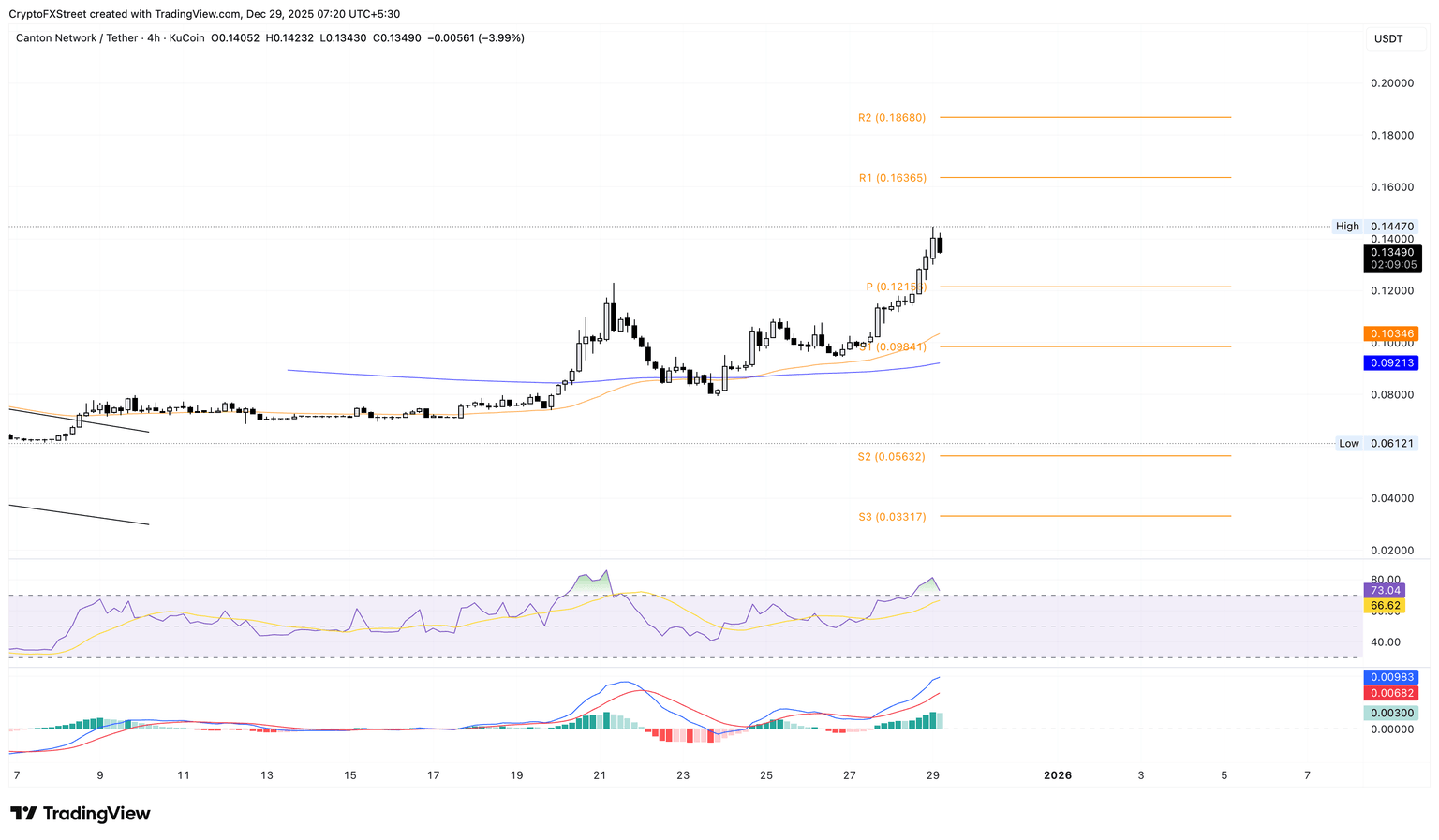 截至周一发稿时,Canton股价下跌4%,在周日飙升23%后,本周开局走低。此前连续三天上涨后出现回调,可能再次测试4小时图上的**枢轴点0.1215美元,随后可能下探0.1000美元的心理关口。