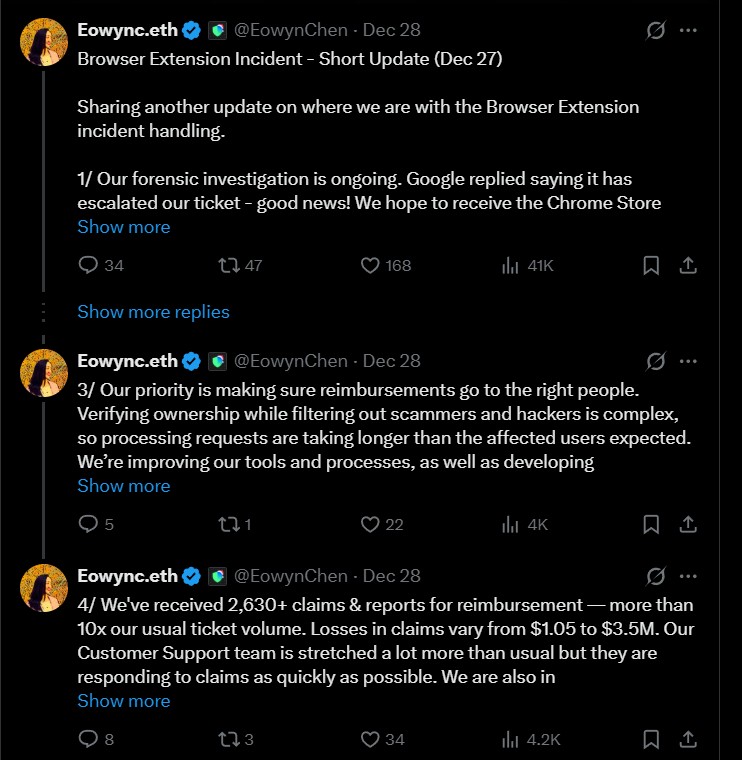 Trust Wallet**执行官Eowyn Chen表示,当前**是确保赔偿流程的准确性,而非速度。团队正通过链上行为分析、登录设备指纹、钱包历史交易模式等**度验证用户身份,防止欺诈行为干扰公平分配。