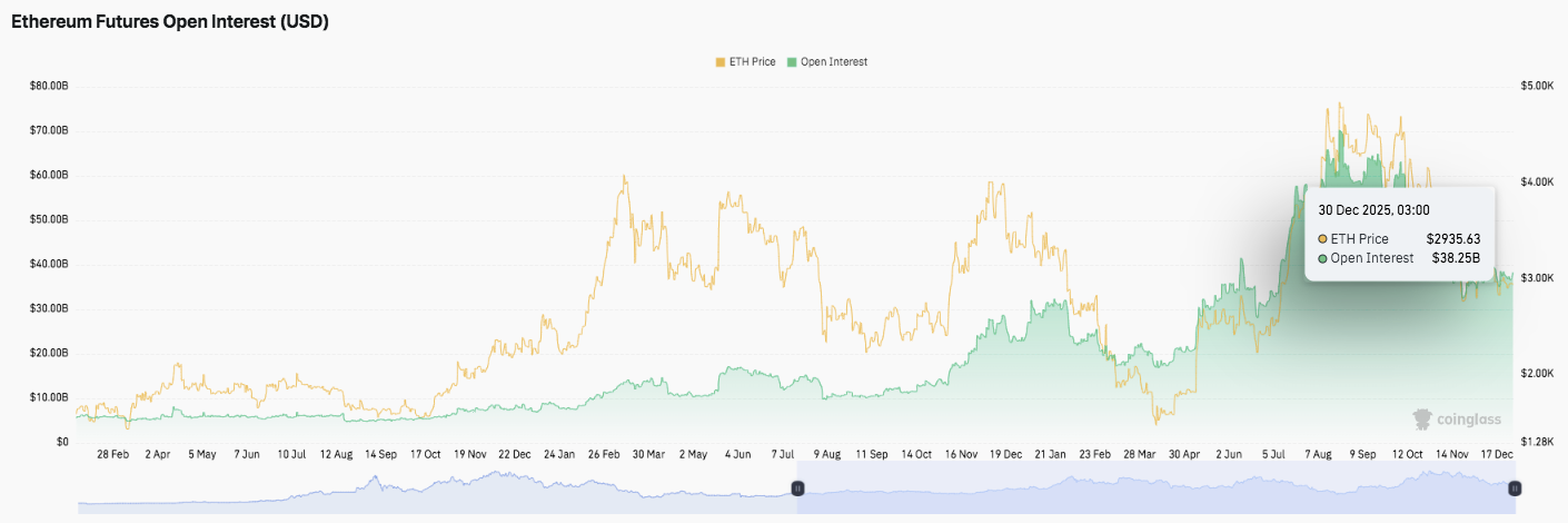 尽管近期价格有所波动,但以太坊期货交易活动仍在持续增长。未平仓合约量全年稳步攀升,反映出衍生品交易参与度的提高。在之前的上涨行情中,未平仓合约量与价格同步增长。值得注意的是,价格回调仅导致未平仓合约量小幅下降。