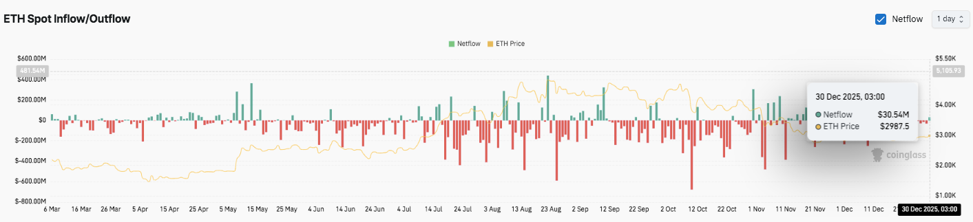 2025 年全年,净资金流动波动剧烈,反映出活跃的仓位配置。12 月 30 日,以太坊录得 3054 万美元的净流入,价格徘徊在 2975 美元附近。值得注意的是,资金流入往往与价格走势一致,强化了吸筹信号。