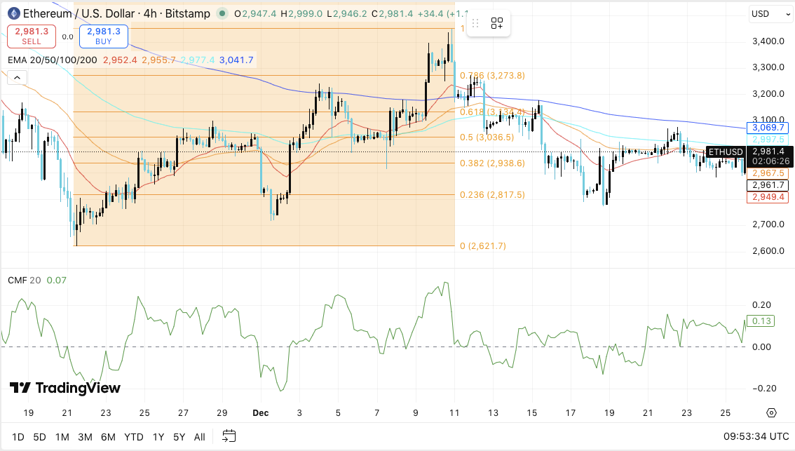 以太坊从 3270 美元至 3300 美元区间回落,并在 2980 美元附近进入横盘整理阶段。这种形态反映的是盘整,而非确认的趋势转变。由于价格在主要移动平均线下方交易,波动性有所收窄。