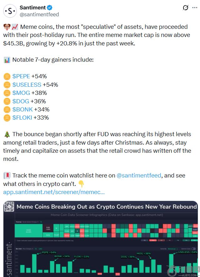 市场情报平台Santiment分析师指出,迷因币反弹“始于圣诞后数日,正当散户交易者的恐惧情绪达到**之时”,并重申市场走向常与普遍预期相悖,强调“务必把握时机,对那些被大众抛弃的资产进行布局”。