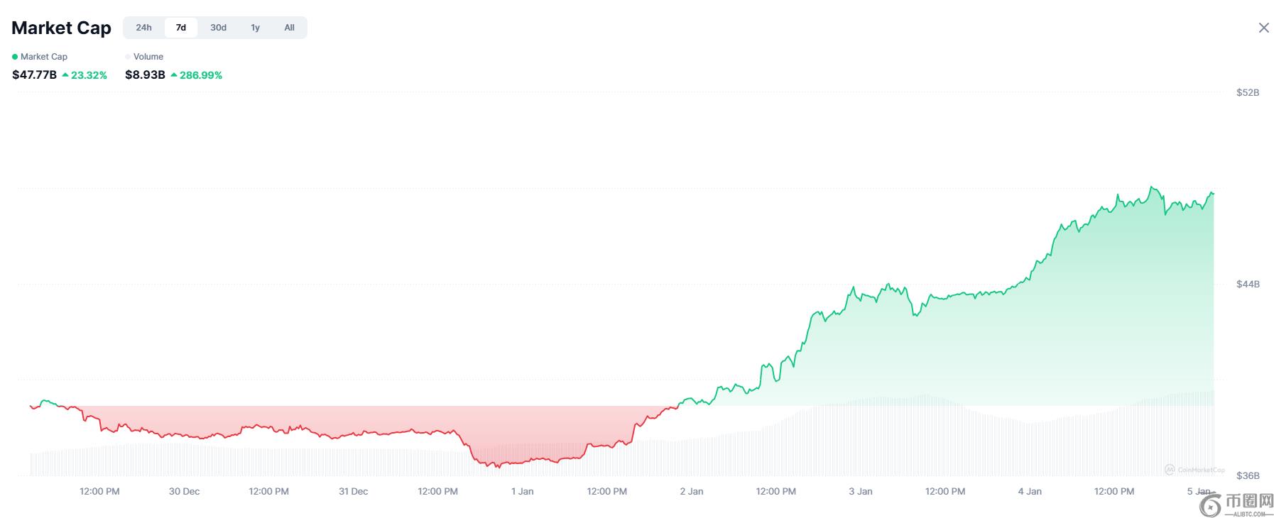 市值前三的迷因币中,狗狗币(DOGE)过去七日涨幅超20%,柴犬币(SHIB)以19.9%的涨幅紧随其后,而佩佩币(PEPE)涨幅最为惊人,超过65%。与此同时,迷因币交易量也与市值同步激增,从12月29日的21.7亿美元跃升至周一的87亿美元,增幅高达300%。