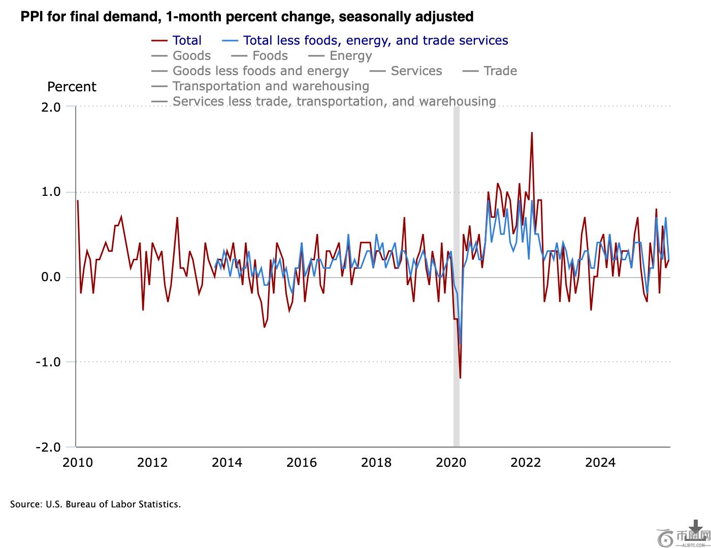 尽管美国劳工**公布的11月PPI同比增速达3%,高于市场预期的2.7%,其中商品价格指数环比上升0.9%,服务价格持平,但加密市场并未出现明显回调。