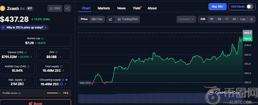 在核心团队退出后,Zcash价格曾暴跌20%,但截至发稿时,数据显示Zcash的交易价格为437.28美元,在过去24小时内上涨了12.5%。其市值也随之上涨12.51%,达到72亿美元。交易量在同一时间段内增长了21.77%,攀升至7.9152亿美元。