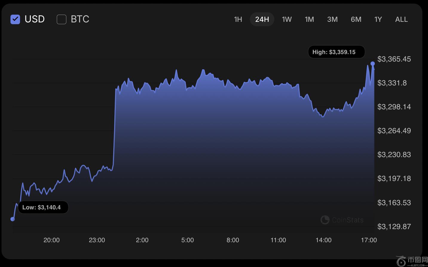 尽管今日出现上涨,ETH的小时图仍保持看涨态势。若日线收盘能维持在当前水平或更高位置,预计明日可能测试3,400美元区域。