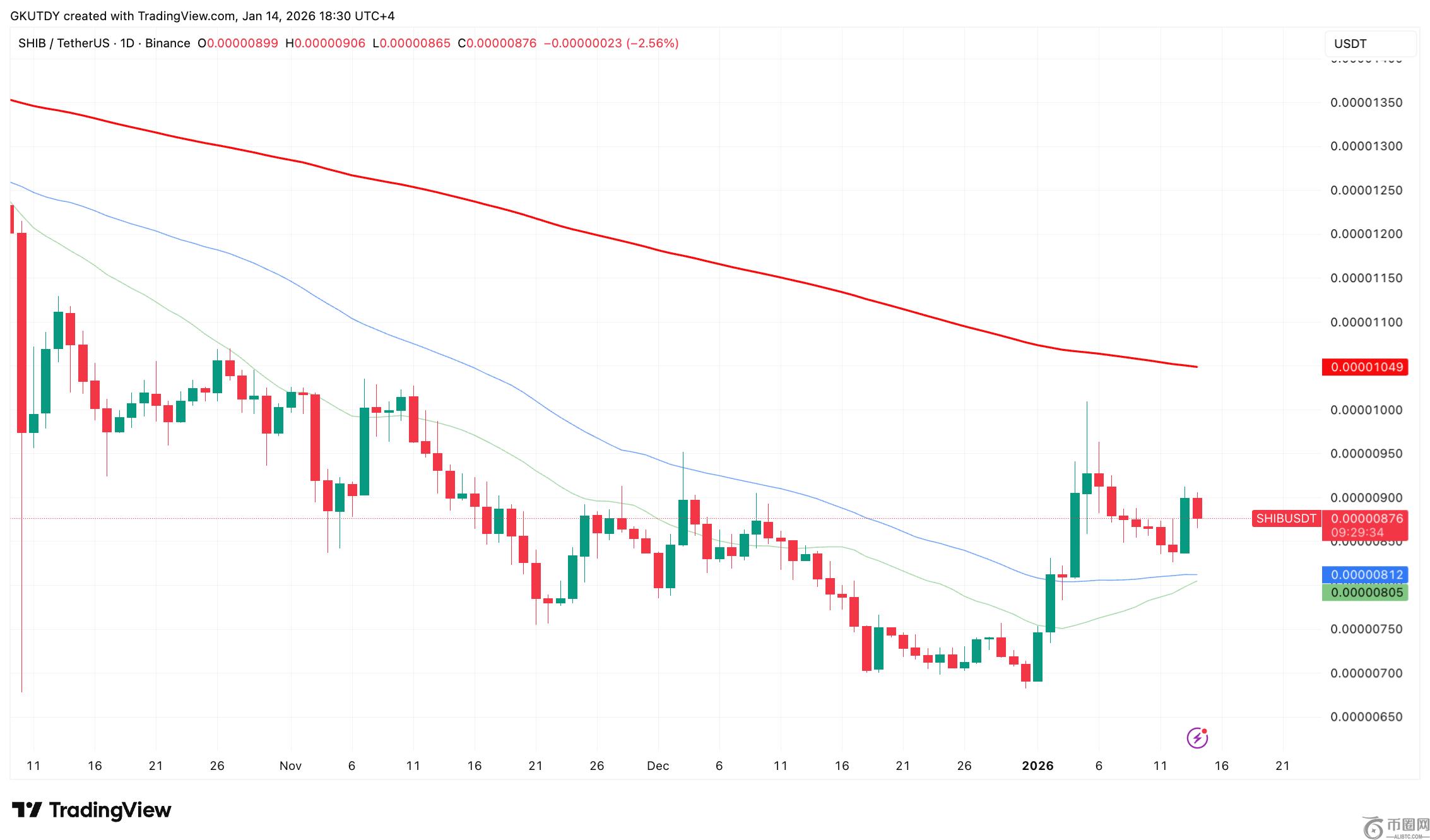 本轮走势的突出之处在于柴犬币价格结构与移动平均线的协同突破。自去年十一月下旬以来,SHIB**重新站上50日均线,而这一复苏态势恰好在长期阻力位下方逐步展开。其金叉形态的后续发展路径可概括为:若能有效突破0.00000950美元关口,200日移动平均线将成为核心目标位,届时或将引发SHIB标志性的快速价值重估行情。虽不及2024年三月那般剧烈,但仍具显著影响。