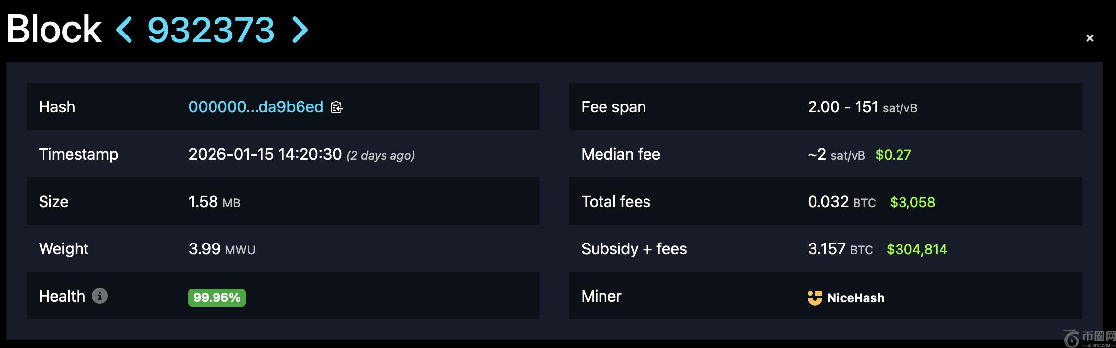 1月15日,周四:第二名独立矿工解决了区块932,373,获得了总计3.157枚比特币,价值304,814美元的收益。