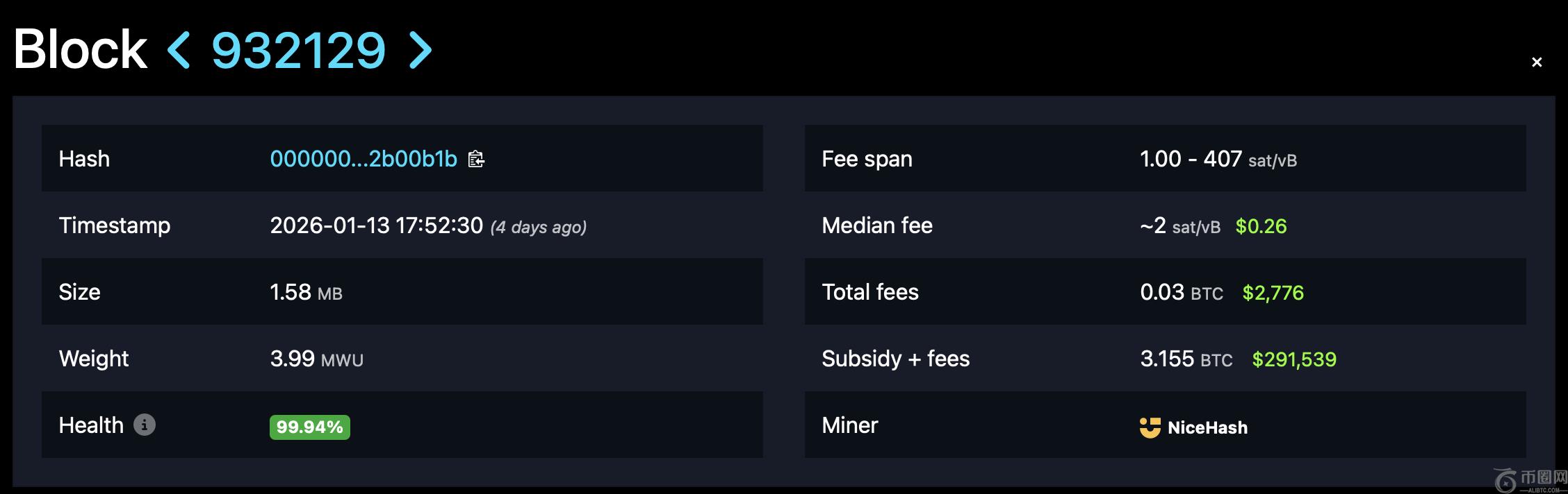 1月13日,周二:一名未知的独立矿工处理了区块932,129,从3.125枚比特币及交易费用中获得了约29.5万美元。