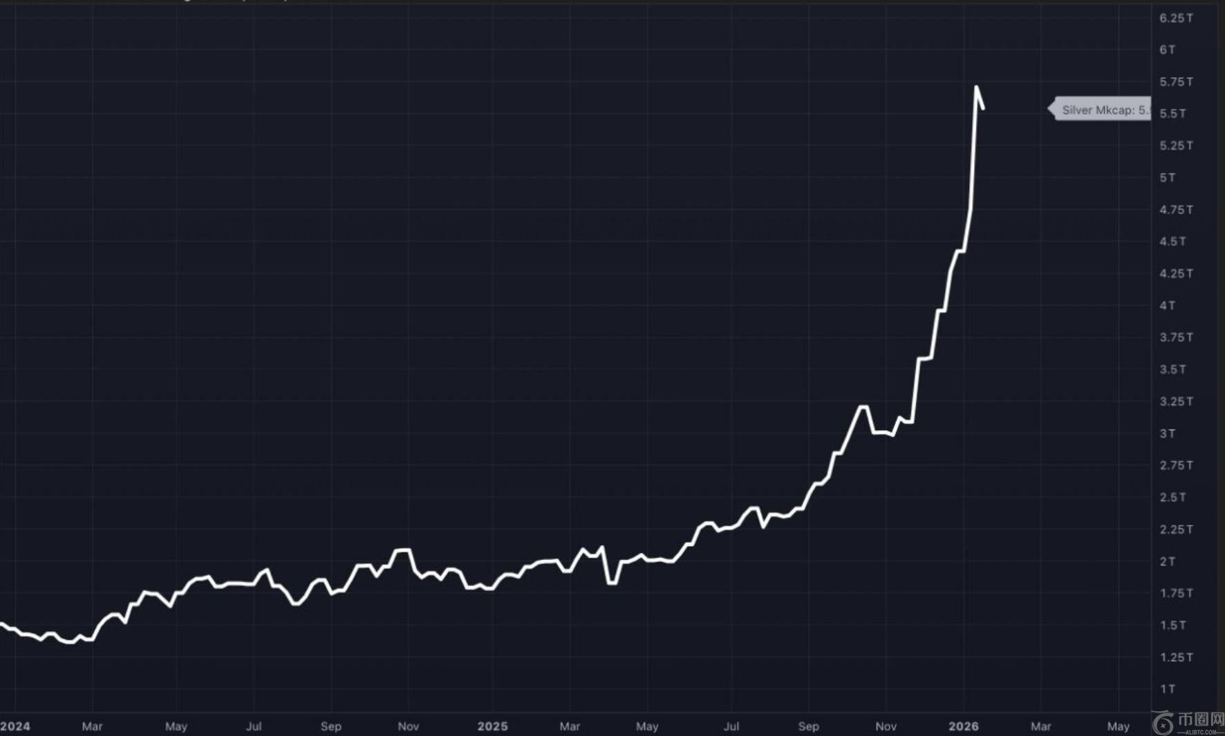 令人瞩目的是其增长的速度与规模。在2024年大部分时间及2025年初,白银市值稳步攀升;然而2025年下半年动能急剧加速,直至2026年初呈现近乎垂直的上涨态势。**数据显示,白银总市值已达约5.5万亿美元。