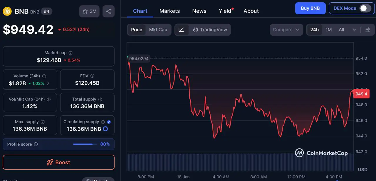BNB 仍然是加密经济中的主导力量。截至撰稿时,其价格接近 949 美元,日交易量约为 18.2 亿美元,该资产持续受益于深度增长。流动性