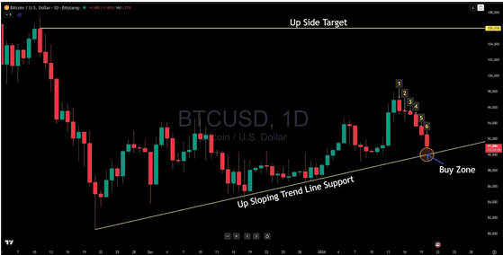 比特币/美元已从近期高点回落近7000美元,但真正的问题不在于跌幅,而在于跌势何时止步。在连续六个交易日遭受抛售压力后,全球**的加密货币比特币/美元价格终于触底反弹。当前,价格正在测试一条自11月下旬以来持续支撑此轮上涨的成熟上升趋势线,这正是技术面开始显现吸引力的关键信号。